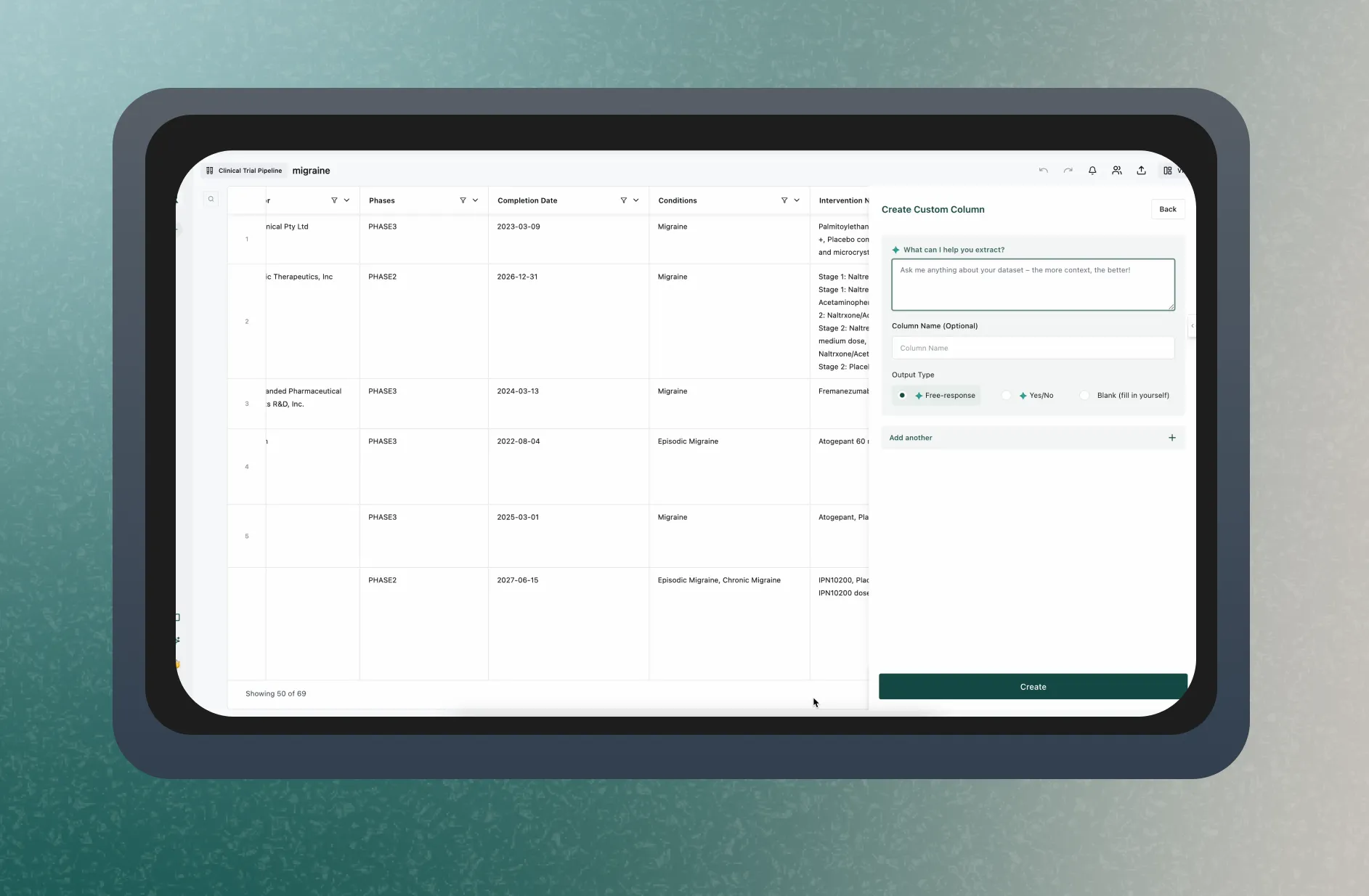 Sometimes, the data you need isn’t explicitly indexed. Tabular allows you to pose questions in plain language, for example, “What are the top trials targeting cancer-specific kinase pathways?” Reliant Tabular’s generative AI processes your query and updates your results with concise, actionable insights.